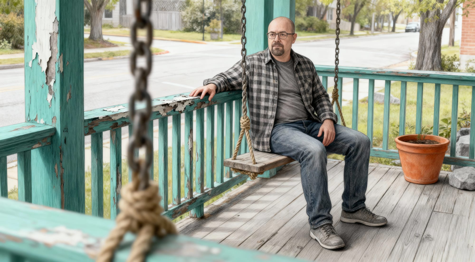Starting off slowly, this is a decent image of Our Handsome Hero on a slightly rundown porch. Fingers all accounted for; the correct amount of limbs. I guess I'd just query what that chain in the foreground is doing.