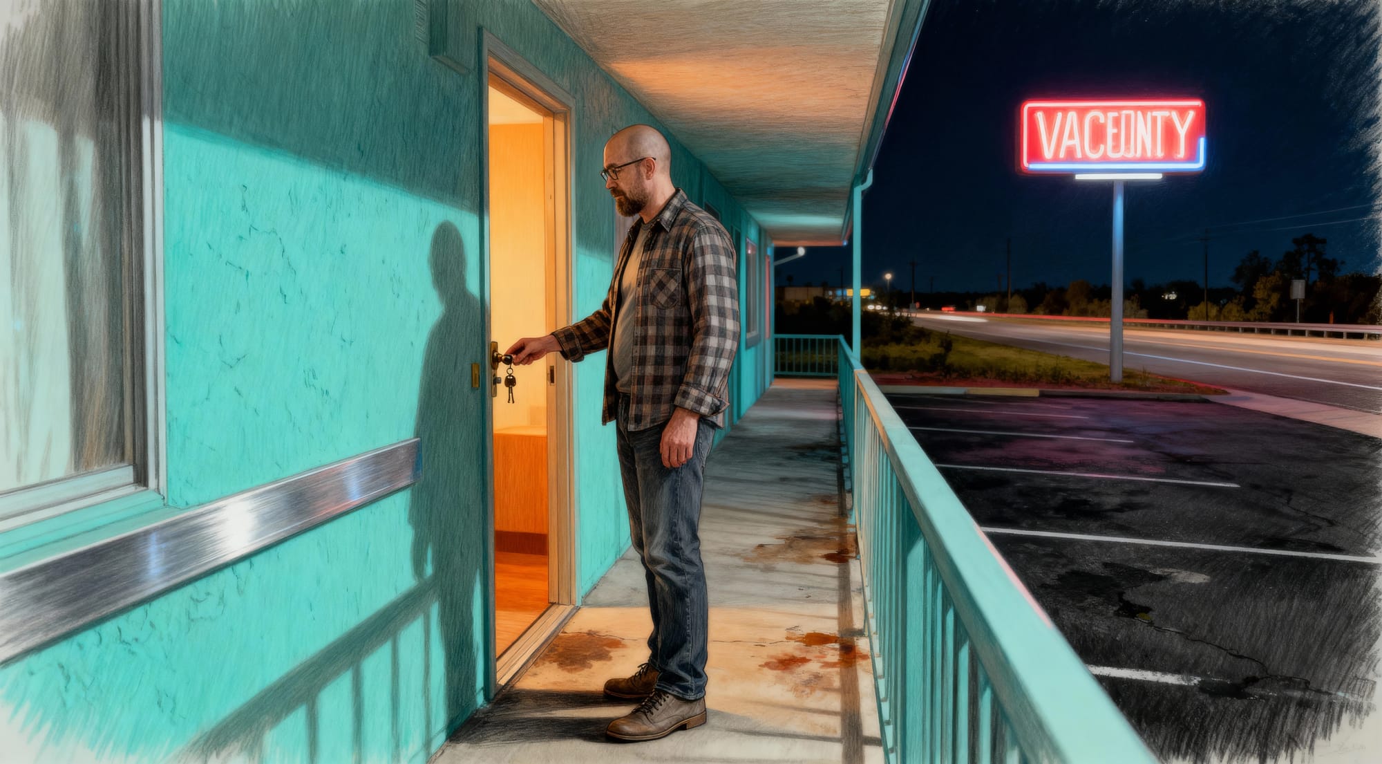 Neon sign saying VACEONTY is easily fixed. The shocking lack of privacy of a transparent motel door is more concerning. Those stains on the concrete...that's not blood, right?