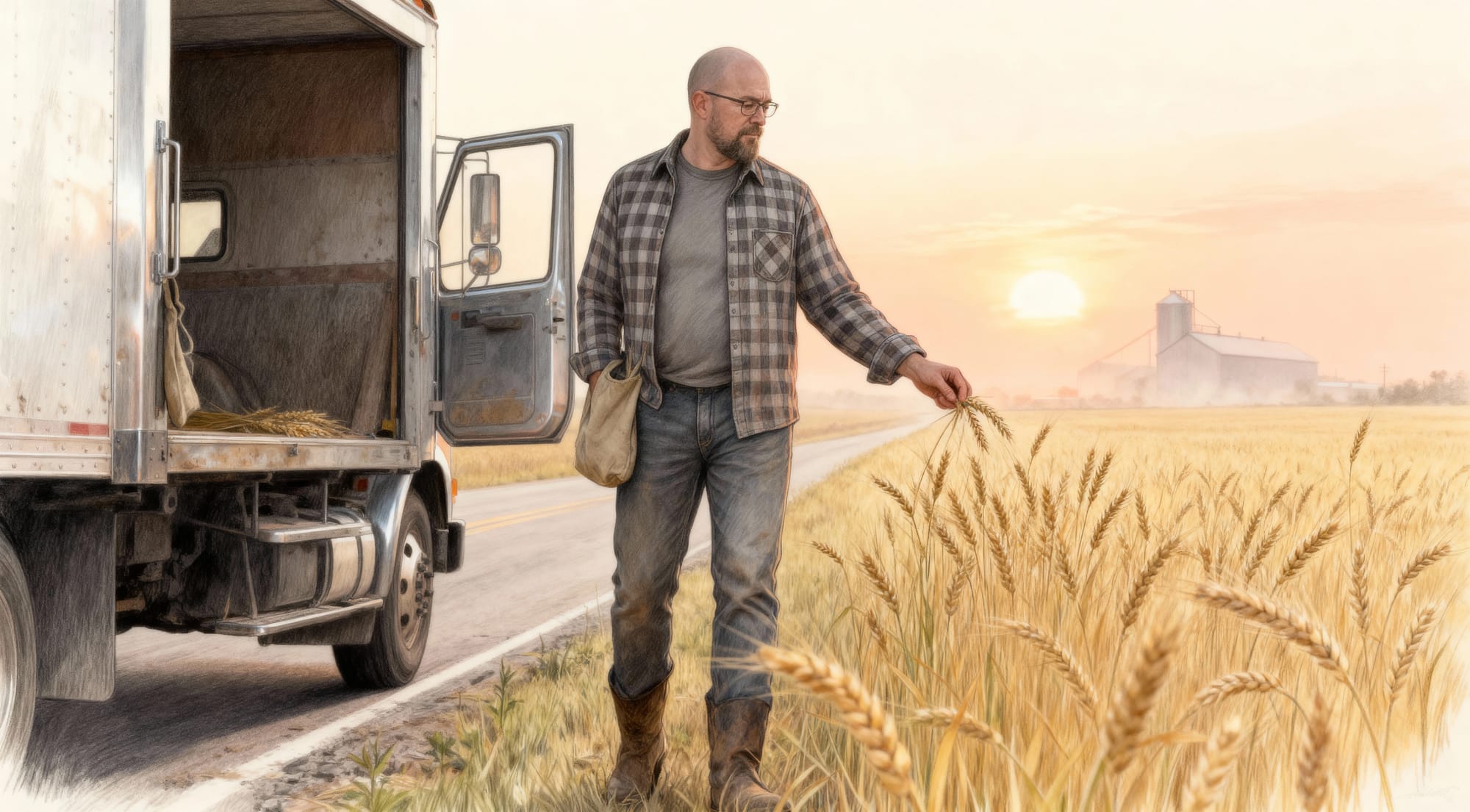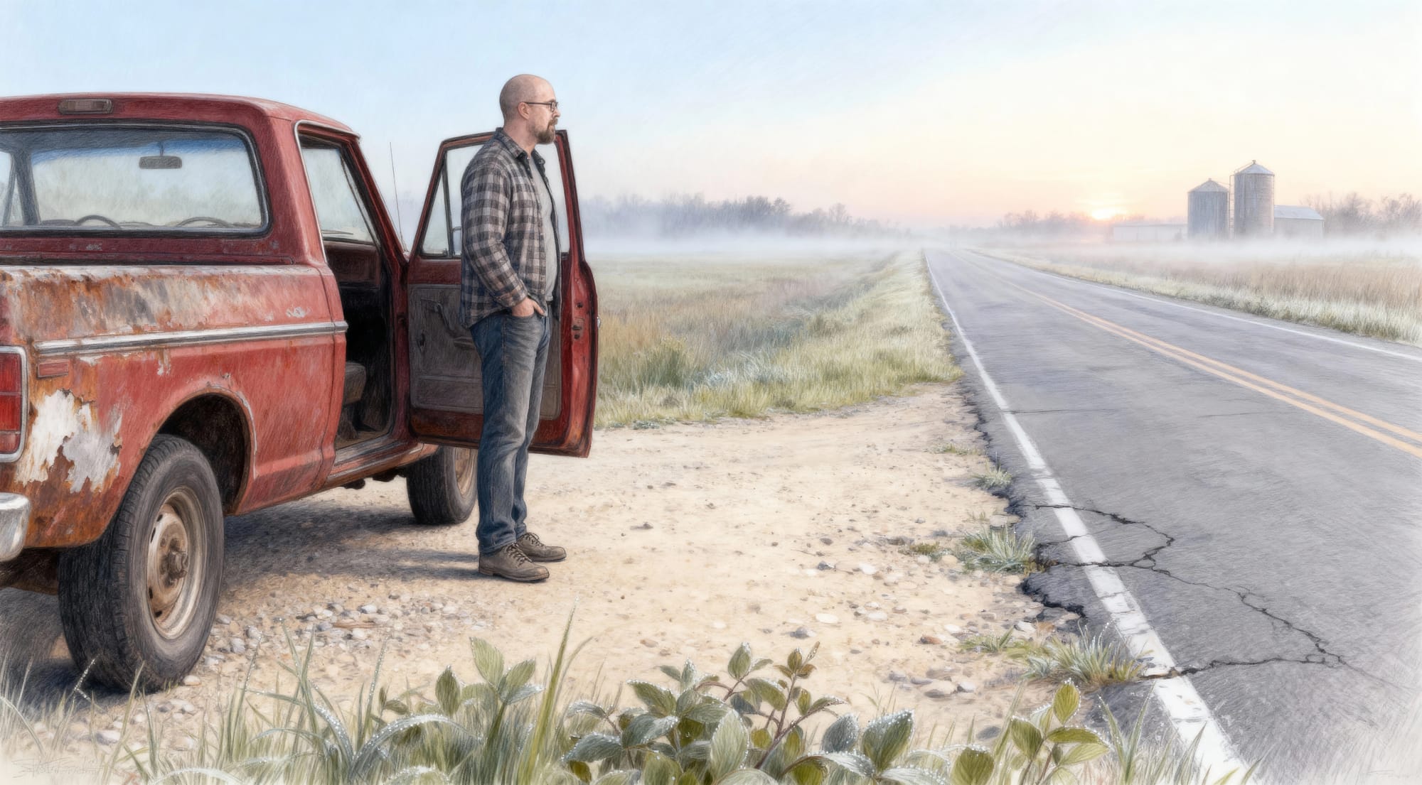 Starting on the right and moving left - it's a soothing, bucolic image of the American Midwest. The pouch attached to Our Handsome Hero's shirt is a little weird. But it's when we get to the truck that things go wrong. That's an underside windscreen he has there. And sure, the steering wheel might be out of shot and he's taken out the passenger seat for more room. But there's no way that door is going to fit that gap.