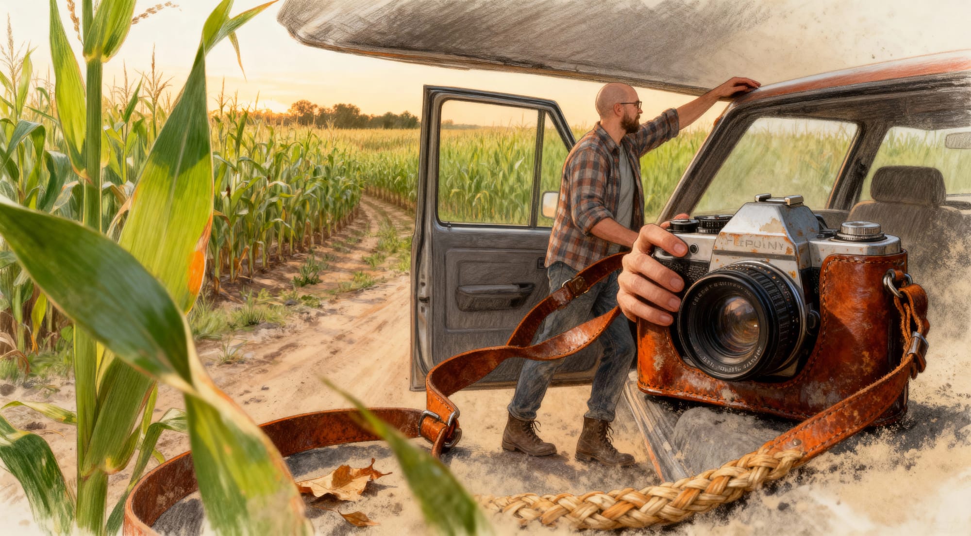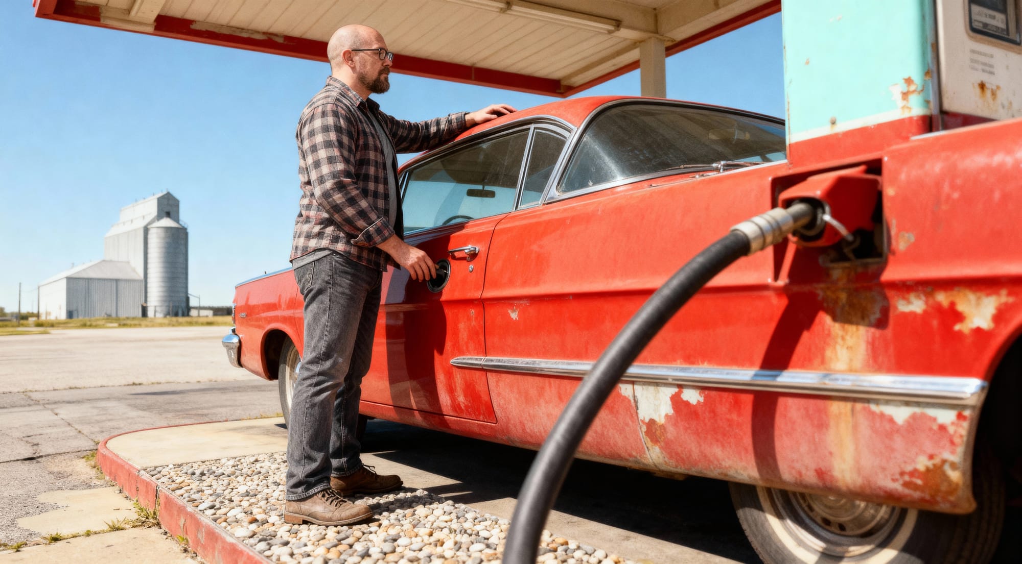 Another lovely image for the Corn Belt Tourist Board. A lovely image, right down to the cracks on the road. And the double steering wheels? Clearly Our Handsome Hero is a driving instructor.