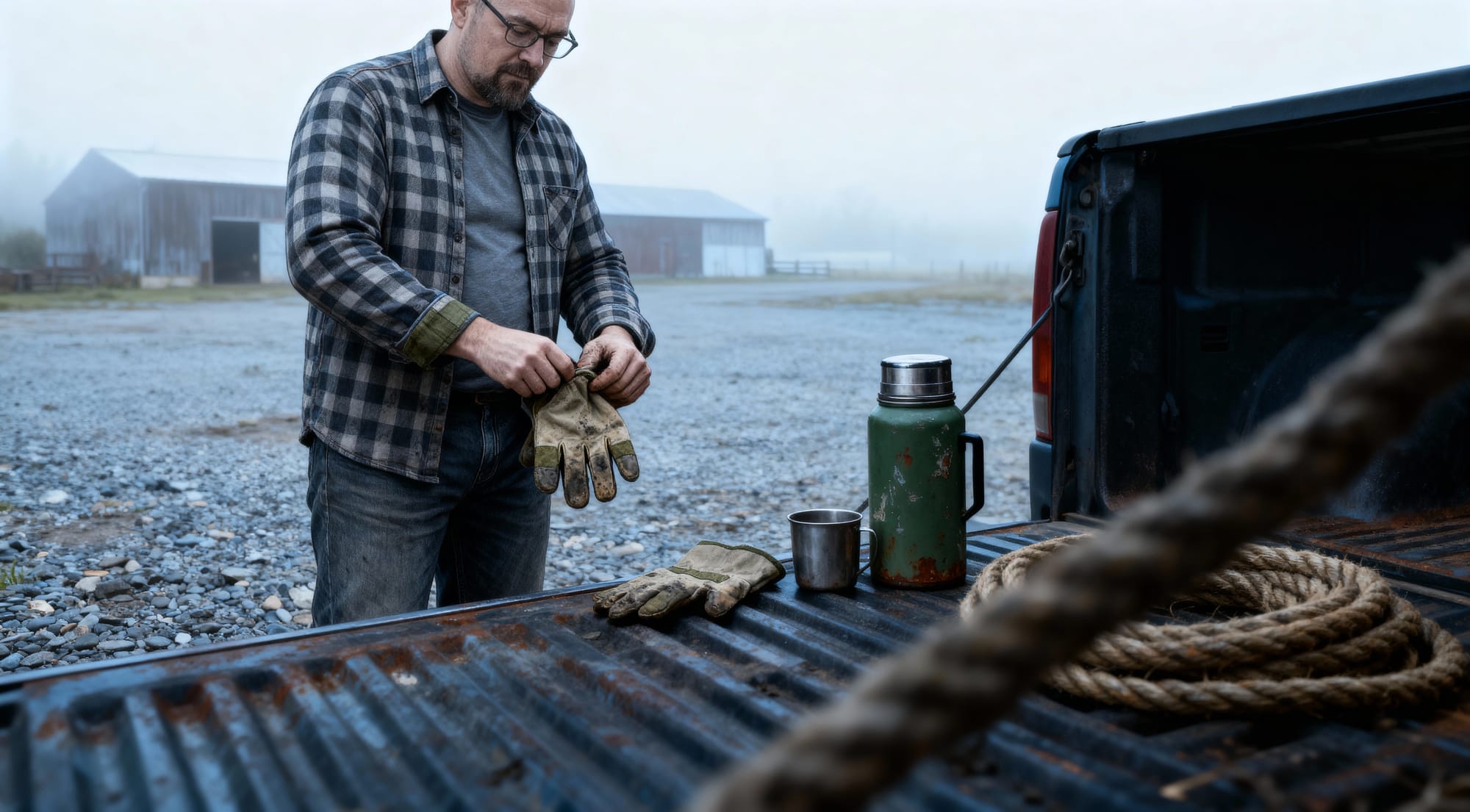 This is my personal favorite. The light is right, the gloves are going on, the flask is battered and well-used. A perfect image of ...Our Handsome Hero...just a workin' man on a farm. But that truck's tailgate is a miracle.