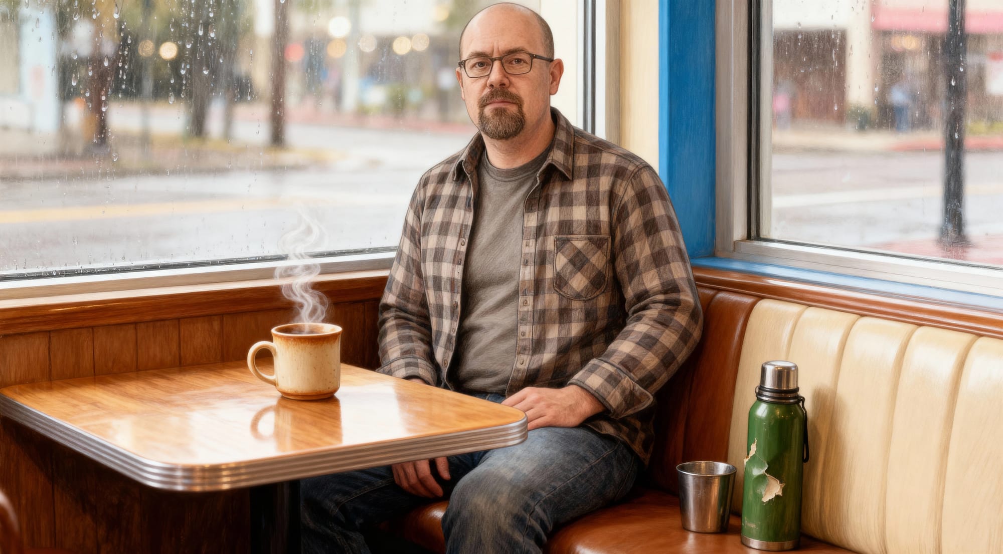 This is surprisingly good. My experience of AI coffee shops is that everyone gets two cups - one being held and one on the table. So this beats that error. And there's the battered flask again - good continuity. So just the teeny-tiny table. So close, AI.