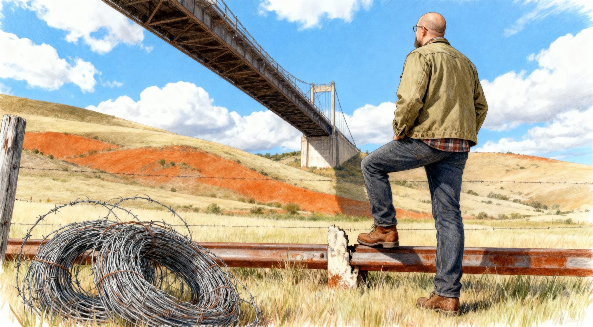 I'm not seeing much wrong with this manly image of a man in sturdy boots looking at a bridge that might be a little fancy to be spanning that non-gap.