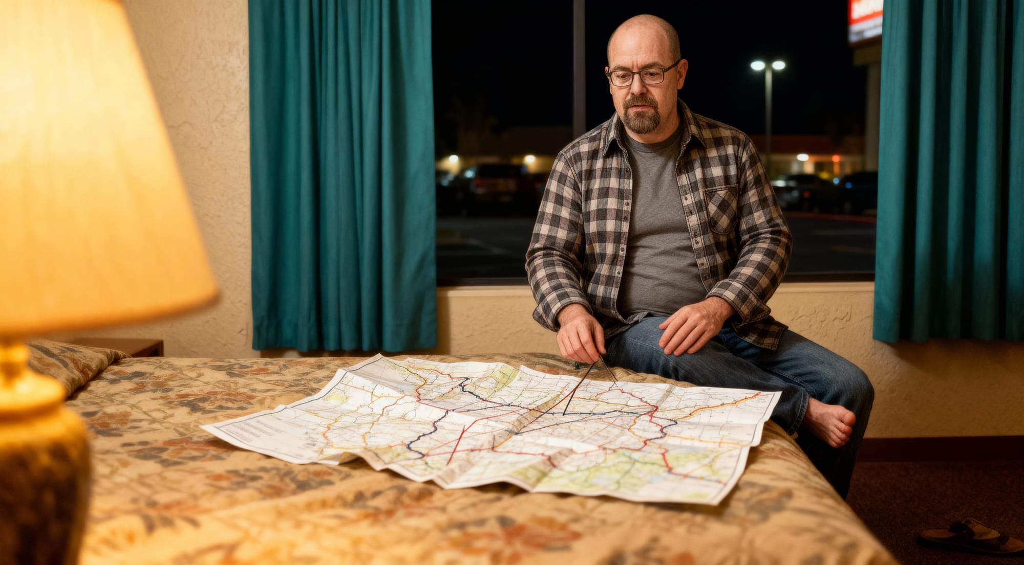 A nicely structured motel room - presumably with a sheet hung up over the transparent door. The lamp is a nice touch, as is the scene outside the window. But Our Handsome Hero's tiny right leg and foot is like something out of Deadpool.