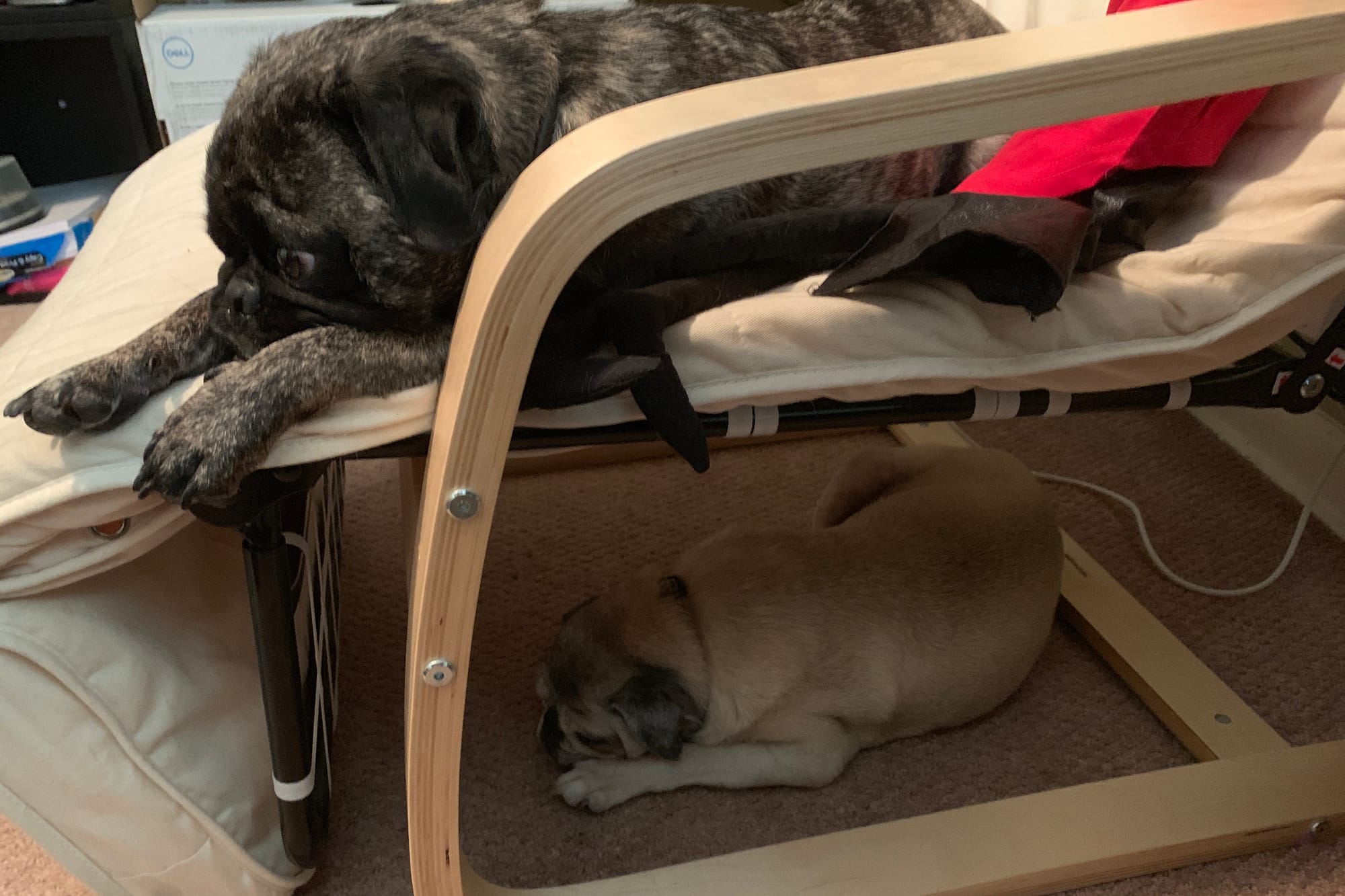 We moved to the office for the day. Things took a while to settle down. Our kids took the beds as they'd done a hundred times before. Big JC followed Little JC around the room until she settled under my chair-that's really-storage. Big JC couldn’t get under there, so he lay beside her. At least for a while, before the pacing began again.