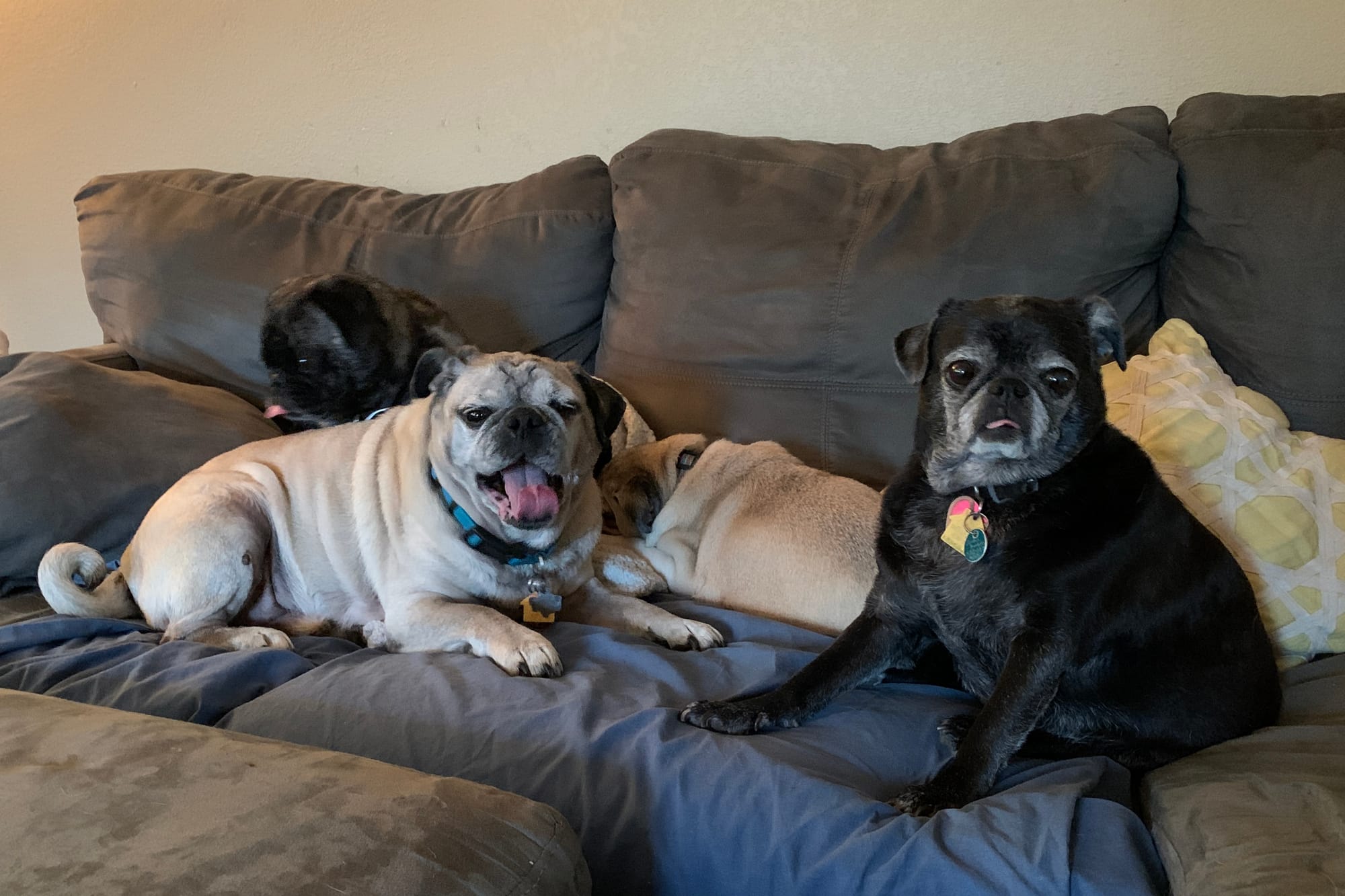 Older pugs come with issues. We knew that from our own Miss Jordan, our original senior pug, who was mostly bad-tempered, had a limp, and her dental situation when we adopted her was nothing short of tragic (and tragically expensive). Having four pugs at the same time might be over-ambitious, we realized, as we helped/hefted them into the car.