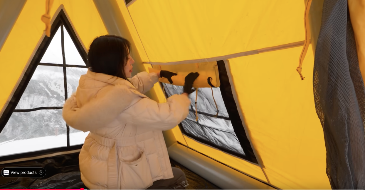 OK, so now she’s set up her suspiciously spotless two-ring burner, her inflatable sofa, her wood-burning stove, her shelves of cooking utensils, more lights than a Christmas display, and a bed. All gadgets you presume being the product placement that is paying for the video. Gadgets are trope number 4. She has circled the tent, unzipping covers from over the many plastic windows and rolling them into tight little tube shapes to be tucked in somewhere above or below the windows. Whatever the weather, she will look around and be happy with her work.